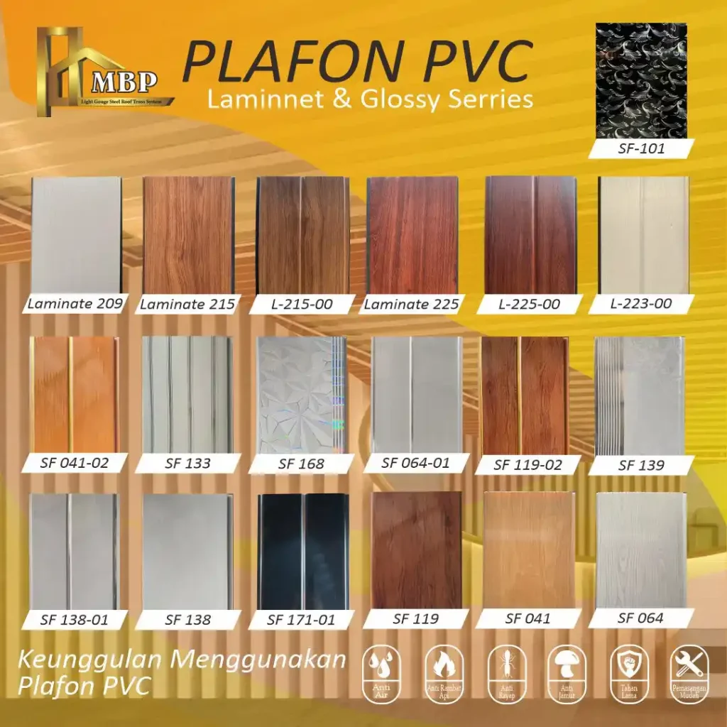 Jual Bahan dan Terpasang Spesialis Plafon PVC, Plafon Gypsum Klasik, Konstruksi Baja Ringan, Atap Berkualitas, Kanopi, Tingkatkan estetika dan daya tahan rumah Anda dengan Plafon PVC Terbaik dari kami. Pilihan ideal untuk segala jenis ruangan.